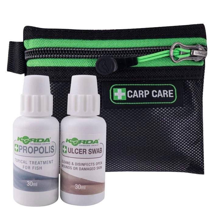 De Carp Care Kit van Korda is een complete set om wonden en zweren van karpers te verzorgen. De Carp Care Kit bestaat uit twee onderdelen en dient op de volgende manier gebruikt worden: Als eerste dient de wond schoon en droog gemaakt te worden. De Ulcer Swab kan gebruikt worden om open wonden en zweren te reinigen en te desinfecteren, vervolgens kan de Propolis gebruikt worden om de wonden af te dichten zodat er geen vuil en bacteriën meer in kunnen komen.